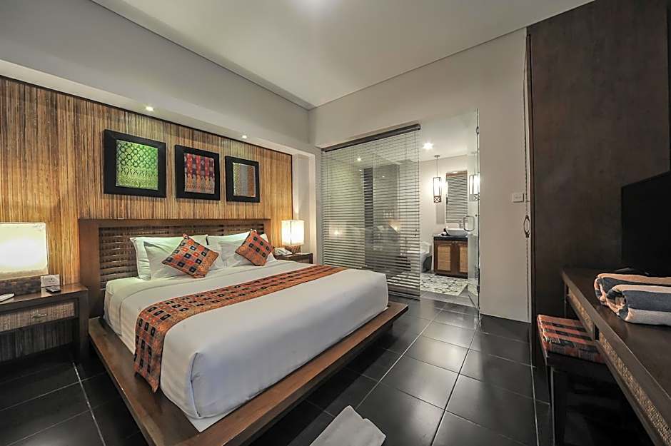 ONE BEDROOM PRIVATE VILLA WITH JACUZZI is 1023 square feet and includes a queen-size bed 150-154 width plus living room, desk, and hairdryer.